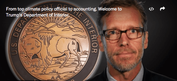 Secretary Zinke: It is well known that you, Deputy Secretary David Bernhardt, and President Trump are shackled to special interests such as oil, gas, and mining. You are unwilling to lead on climate change, and cannot be trusted with our nation’s natural resources. So for those three compelling reasons – poor leadership, waste, and your failures on climate change, I tender my resignation. The best use of my skills is to join with the majority of Americans who understand what’s at stake, working to find ways to innovate and thrive despite the many hurdles ahead. You have not silenced me; I will continue to be an outspoken advocate for action, and my voice will be part of the American chorus calling for your resignation so that someone loyal to the interests of all Americans, not just special interests, can take your job. My thoughts and wishes are with the career women and men who remain at DOI. I encourage them to persist when possible, resist when necessary, and speak truth to power so the institution may recover and thrive once this assault on its mission is over. Joel Clement 4 October, 2017