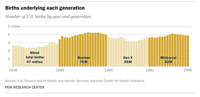 Millennials overtake Baby Boomers as America’s largest generation https://www.pewresearch.org/fact-tank/2020/04/28/millennials-overtake-baby-boomers-as-americas-largest-generation/